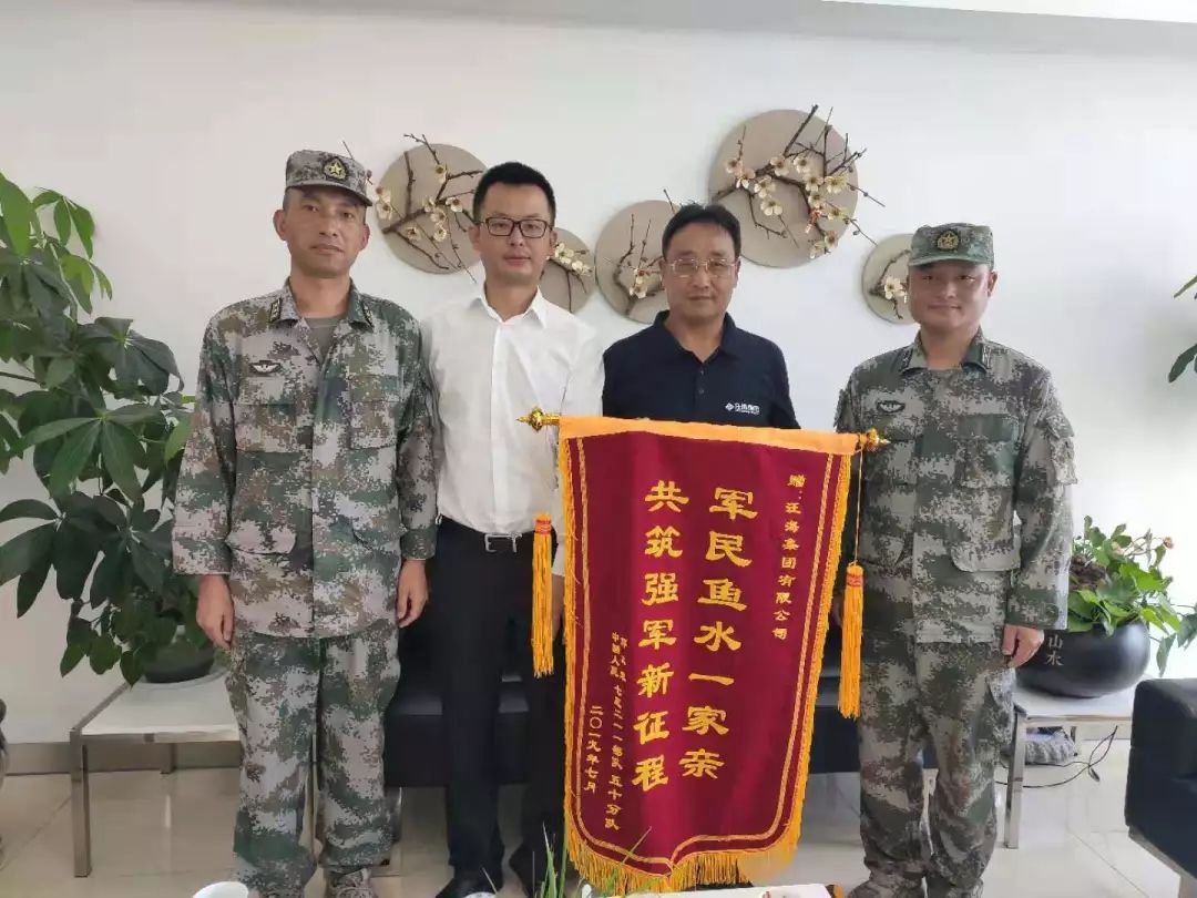 7月24日,部队相关领导一行莅临集团,授予汪海集团锦旗“军民鱼水一家亲,共筑强军新征程”。汪海集团将始终秉承军民一家亲的优良传统,一如既往地关心、支持部队驻训,尽最大努力为部队驻训提供便利条件,广泛深入开展好军民共建活动。
