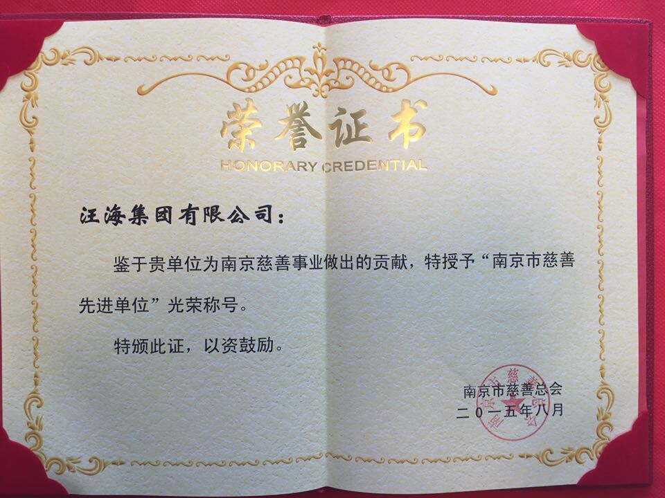 汪海集团作为南京市慈善先进单位得到了慈善总会的表彰。