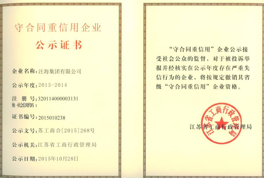 诚信为企业之本,汪海集团自创立以来,一直将“守合同重信用”的理念贯穿于企业经营的整个过程,不断健全企业信用管理机制,促进企业依法生产经营,提高合同履约率,提升了企业形象、增强了企业核心竞争力。汪海集团作为南京市诚信经营的优秀民营企业代表,本次荣获2013~2014年度省级“守合同重信用”企业称号,也是社会各界对企业信守承诺、规范经营的认可,也树立起了一个“诚信为本,守法经营,优质服务”的良好榜样!