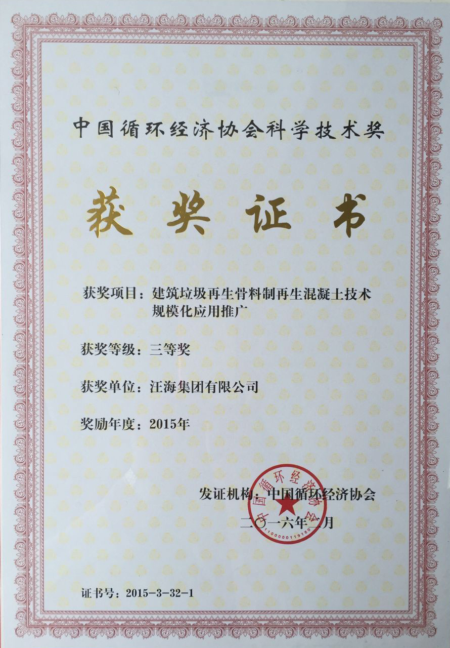 中国循环经济协会针对在循环经济和资源综合利用领域的研究、制造业的节能降耗、可再生能源工程技术、环境工程技术等领域具有深远影响的优秀科技成果,设立科学技术奖,以表彰在全国循环经济科技工作中做出突出贡献者。我集团“建筑垃圾再生骨料制再生混凝土技术规模化应用”项目,在经过现场专家评审、公示后,在数百项申报项目中脱颖而出,获得三等奖。